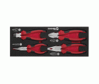 Incluye un alicate universal de 180 mm, dos alicates de corte diagonal (160 mm y 180 mm) y un alicate de punta semiredonda de 160 mm.