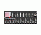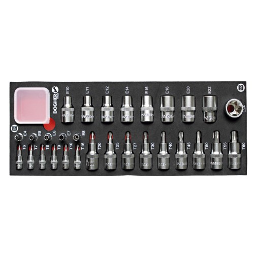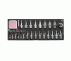 Bandeja combinable 1/4 con 29 vasos y punta Torx 1/4 y 1/2, diseñada para un uso profesional en carros de taller.