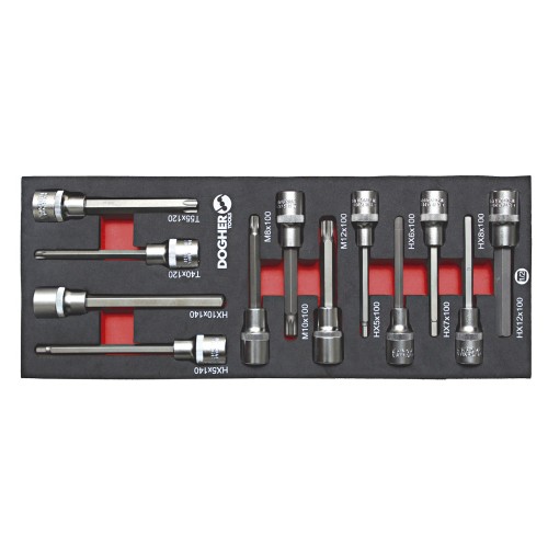 La bandeja combinable de 1/4 con 12 vasos de punta larga 1/2 es la solución perfecta para mantener organizadas y siempre a mano tus herramientas de precisión en el carro de taller.