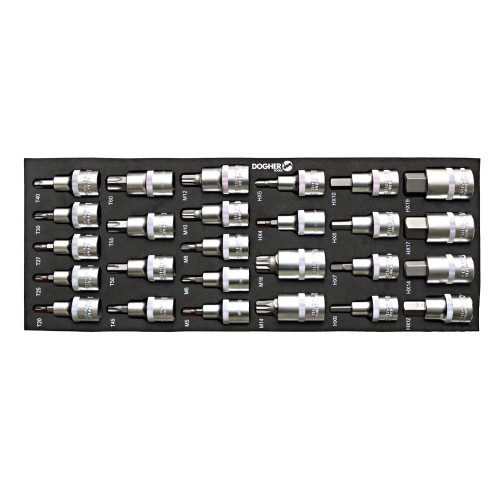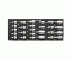 Bandeja combinable 1/4 con 29 vasos de punta 1/2, diseñada para encajar perfectamente en carros de taller profesionales.