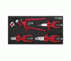 La bandeja combinable 1/3 con 3 alicates y una tenacilla es el módulo ideal para organizar herramientas en carros de taller.