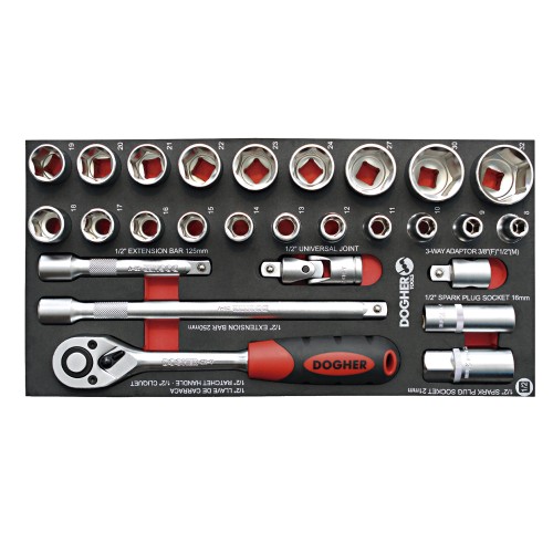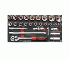 La bandeja combinable 1/3 con 27 vasos hexagonales 1/2" es una solución profesional para optimizar el espacio y la organización en carros de taller.