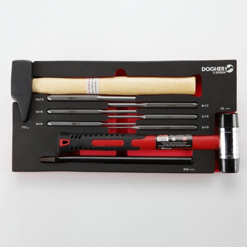 Incluye martillo peña para trabajos de percusión sobre piezas metálicas.