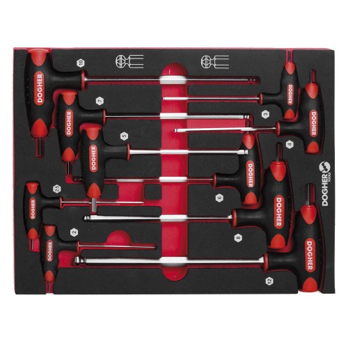 Bandeja combinable 1/2 equipada con 10 llaves T hexagonales de perfil redondo, diseñada para su uso en carros de taller profesionales.