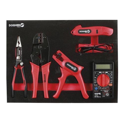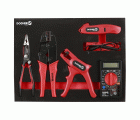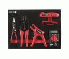 Bandeja combinable de 1/2 módulo diseñada específicamente para electricistas, que incluye 5 herramientas esenciales para trabajos de instalación, reparación y mantenimiento eléctrico.