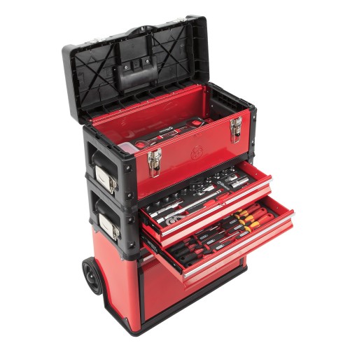 Trolley de color rojo con 3 módulos desmontables para una mayor versatilidad en el transporte de herramientas.
