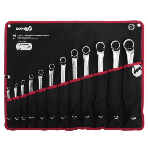 Bolsa de nylon diseñada para almacenar y transportar un juego de 12 llaves combinadas de dos bocas o estrella acodada fabricadas en acero cromo vanadio (CrV).