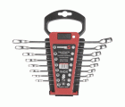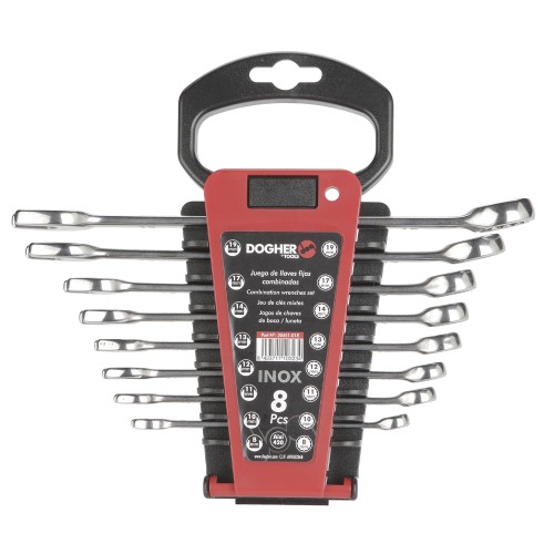 Juego de 8 llaves fijas combinadas fabricadas en acero inoxidable AISI 420, ideal para entornos exigentes donde se requiere resistencia a la corrosión.