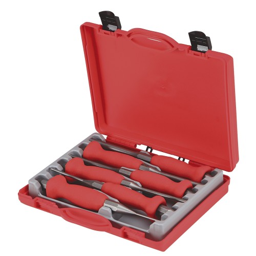 Cofre profesional que contiene 6 botadores cilíndricos fabricados en resistente acero Cromo Vanadio, ideales para trabajos de precisión en talleres mecánicos o industriales.