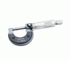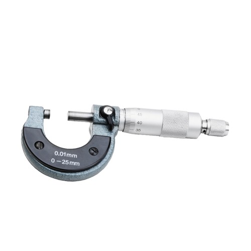 Micrómetro centesimal de precisión diseñado para mediciones externas en rangos de 0 a 25 mm, con una resolución de 0,01 mm.