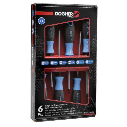 El juego de 6 destornilladores Industrial Plus incluye 4 puntas planas y 2 Pozidriv, ideales para aplicaciones profesionales.