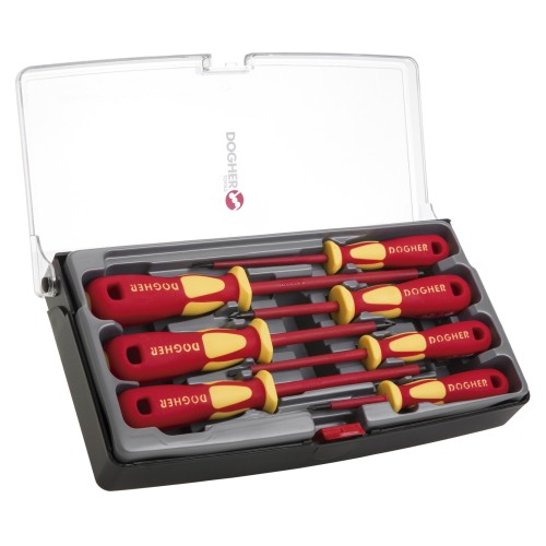 El juego de 7 destornilladores profesionales aislados DOGHER VDE 1000V está diseñado para ofrecer máxima seguridad en trabajos eléctricos.