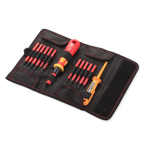 Incluye una funda práctica para el transporte y la organización del juego completo, ideal para profesionales eléctricos e industriales.
