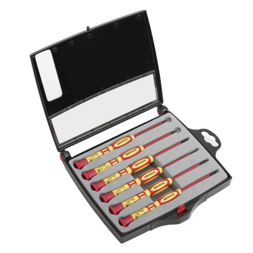 Juego de 6 destornilladores profesionales de precisión aislados VDE, diseñados para trabajos en entornos eléctricos de alta exigencia.