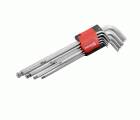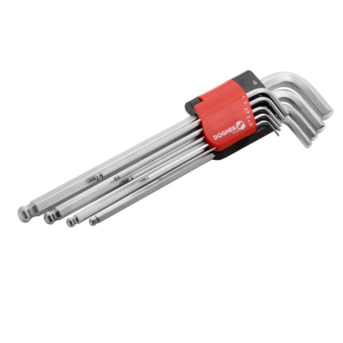 Juego de 9 llaves macho hexagonales DOGHER Tools con diseño de extremo redondeado y cuerpo extra largo para acceder a tornillos en ubicaciones profundas o de difícil acceso.