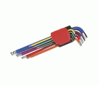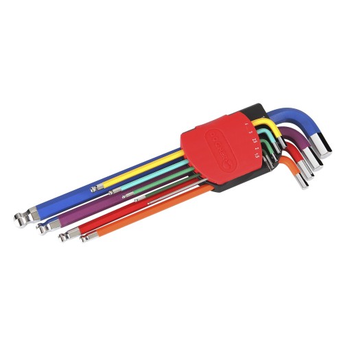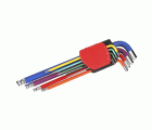 Juego de llaves macho hexagonales de 9 piezas con diseño redondeado y acabado en colores diferenciados por medida.