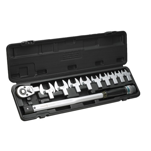 Este estuche profesional incluye una llave dinamométrica con cabezas intercambiables de inserción 14x18 mm y un rango de apriete de 40 a 200 Nm.