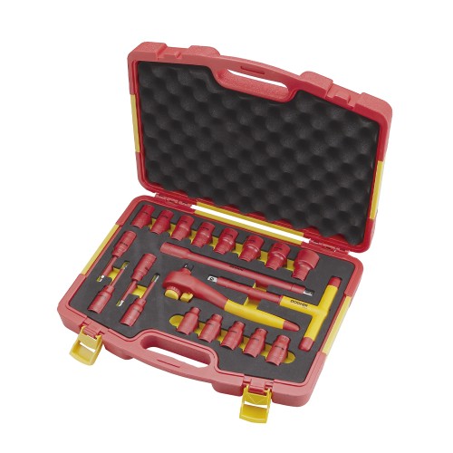 Maletín profesional compuesto por 20 piezas de llave de vaso hexagonal con cuadradillo de 1/2", totalmente aisladas según norma VDE para trabajos en entornos con riesgo eléctrico.